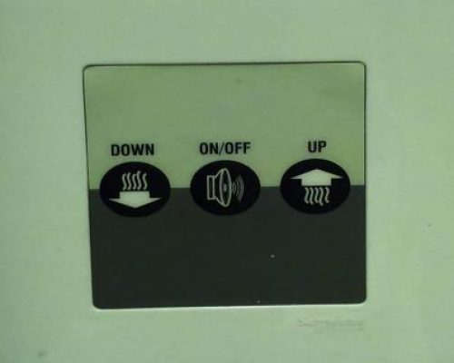Unit- Volume control key with control unit. Features- Micro push button controlled volume with off/on features for bathroom speakers, Enjoy the AV sound in bathroom. (g) Electronic Thermostat Module-3M Dimension-H 45mm, W 75mm Color-Black/White/Grey Unit- Digital thermostat key with control unit Features- Micro push button operation, Digital display indicator, Temperature operating range 18°C to 28°C, Three speed control with on/off, Microprocessor based energy saving mode, System integration with rj45 connector and cat6 cable.